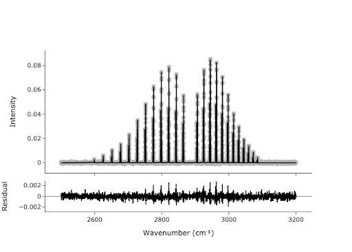 plotFit(result, residual = True, xlabel = f"Wavenumber ({chem.wavenumber})", ylabel = 'Intensity', output = 'browser')