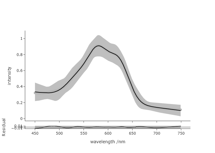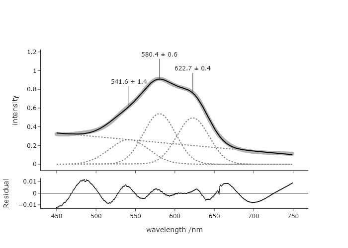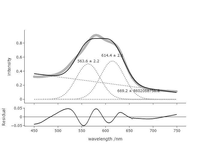 This suggests that either the restriction to 3 features is not correct, that the band is made up of these three bands with very different widths, or that one needs to impose a chemically reasonable shape on the fit.