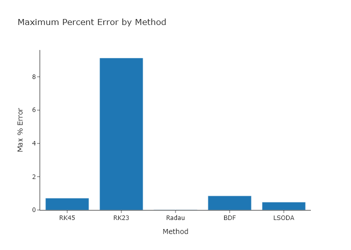 Working from the code presented in Section \ref{Simulating_the_kinetics_of_one_elementary_reaction_using_scipy.solve_ivp}, use every option for the method keyword argument of scipy.solve_ivp() and compare the maximum error obtained. Try making a bar chart to compare these values, using Plotly. You can read the documentation in Chapter \ref{ch:plotly} for this, or use the quickBar() function out of codechembook.
