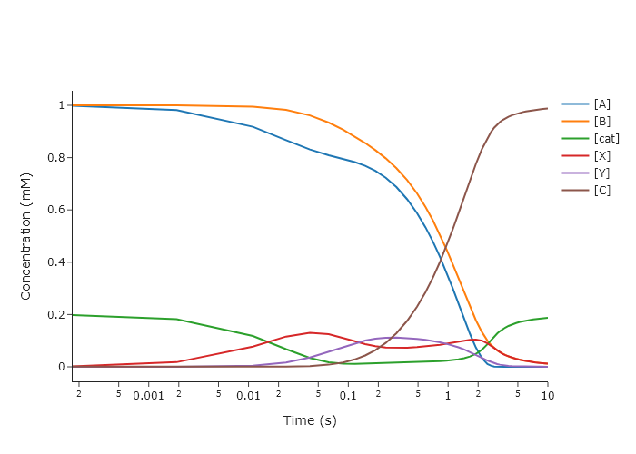 A, B, cat, X, Y, C = y # unpack concentrations to convenient variables