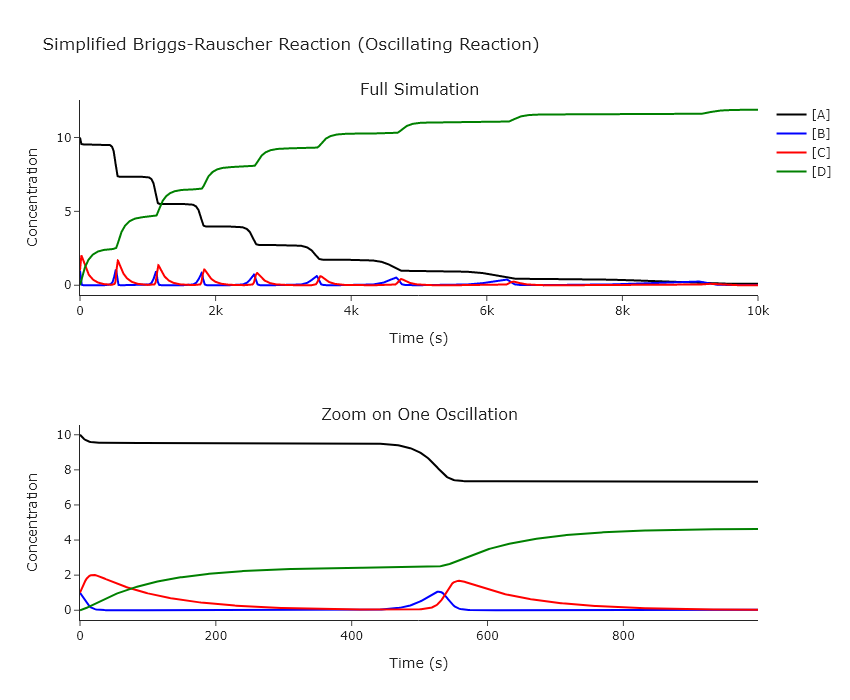 Modify our ODE solving code to work on this system. Good starting points are initial concentrations $[A]_0 = 10$, $[B]_0 = 1$, $[C]_0 = 1$, $[D]_0 = 0$, $k_1 = 0.005$, $k_2 = 0.1$, $k_3 = 0.01$, and $t_{max} = 10000$. Change the initial concentrations and rates one at a time. Provide plots that show how all concentrations change with time, both for the full time range and one oscillation. Explain how this reaction works, particularly how it can oscillate even though all the reactions are forward only. Show the behavior at several limits in the rates and initial concentrations, particularly where the system no longer oscillates.